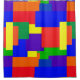 Esta cortina de chá colorida apresenta um design de colcha de retalhos em cores do arco-íris com um aspecto texturizado.