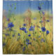 A chicória azul vívida e as flores de milho florescem num campo ouro de grama sob um céu azul pálido. O fundo loiro e verde também é interrompido pelo cintilante rosa das flores de capim-comum.