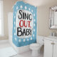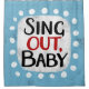 "Sing Out, Baby" é um design de texto fofo em azul claro com texto preto e vermelho, juntamente com uma forma de sotaque branca e pontos brancos texturizados ao seu redor.