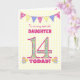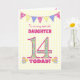 Um cartão de aniversário de 14 bonito para sua filha, com bunting de bolinhas, flores de primata e números preenchidos com um padrão de purrose, todos em um fundo de gingham amarelo pálido. A mensagem do cobrir é: "Para uma FILHA muito especial 14 HOJE!" A mensagem dentro é apenas uma sugestão e você pode personalizá-la facilmente ou excluí-la se preferir.