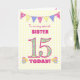 Um cartão de aniversário de 15 bonito para sua irmã, com bunting de bolinhas, flores de primata e números cheios de padrão primata, tudo em um fundo de gingham amarelo pálido. A mensagem do cobrir é: "Para uma IRMÃ muito especial 15 HOJE!" A mensagem dentro é apenas uma sugestão e você pode personalizá-la facilmente ou excluí-la se preferir.