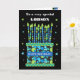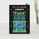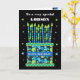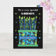 Um cartão de aniversário brilhante para seu afilhado, com muitas velas apadrinhadas em um bolo de aniversário. No topo do cobrir da frente, as palavras "A um GODSON muito especial" encontram-se em letras brancas sobre o fundo negro. Há uma banda azul ao redor do bolo com "FELIZ ANIVERSÁRIO!" também em branco. Minúsculas estrelas azuis, verdes e brancas estão espalhadas em volta do fundo preto e o dentro é apenas uma sugestão, que você pode facilmente mudar ou apagar se quiser.