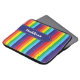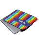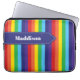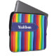 Esta brilhante bolsa de laptop de padrão listrado do arco-íris tem uma fita de faixa azul indigo com detalhes de costura brancos na parte superior. Ele é personalizado com um nome ou qualquer texto que você queira adicionar.