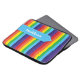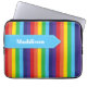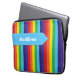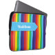 Esta brilhante bolsa de laptop de padrão listrado do arco-íris tem uma fita de faixa azul-clara com detalhes de costura brancos na parte superior. Ele é personalizado com um nome ou qualquer texto que você queira adicionar.