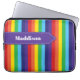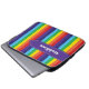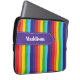Esta brilhante bolsa de laptop de padrão listrado do arco-íris tem uma faixa de faixa roxa com detalhes de costura brancos no topo. Ele é personalizado com um nome ou qualquer texto que você queira adicionar.