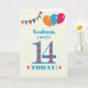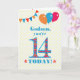 Um cartão de aniversário colorido para um madrinho de 14 anos, O grande número 14 está cheio de um padrão laranja, vermelho e azul, esboçado em azul brilhante. Há balões e bunting no topo, em cores coincidentes e a saudação do cobrir é, 'Godson, você tem 14 anos hoje!' em letras brilhantes vermelhas e azuis, em um fundo bolinhas amarelo e branco muito pálido, com estrelas vermelhas e laranja em cada lado da palavra 'HOJE!'. A mensagem dentro pode ser facilmente personalizada ou excluída se você desejar.