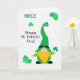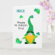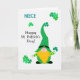 Um cartão de boas-vindas para a sua sobrinha na Rua. Dia de Patrick, com um duende giro, segurando um shamrock. O duende tem um chapéu muito alto, em um padrão verde, uma barba grande de gengibre, um nariz enorme, capas e meias listradas e calçados pretas. No topo, em letras verdes escuras, está a palavra "NIECE" e a mensagem dentro é fácil de personalizar ou apagar.