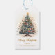 Etiquetas de presentes de Natal bonitas e festivas, com árvore de Natal, ornamentos com texto "Feliz Natal" mostrado abaixo em uma dourada. Personalize a etiqueta de presente com seu nome. A parte de trás da etiqueta apresenta um fundo de ouro nevado.