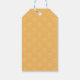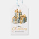 Etiquetas de presentes festivas com caixas para presentes, fita de ouro com texto "Feliz Natal" mostrado abaixo. Personalize a etiqueta de presente com seu nome. A parte de trás da etiqueta apresenta um padrão de caixa-presente com fundo amarelo.