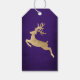 Etiquetas de presentes de Natal personalizadas e contemporâneas decoradas com renas de ouro no fundo de vidro roxo.