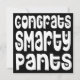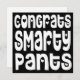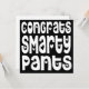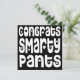 Felicita alto e bom som em estilo divertido ao formando ou a qualquer um que seja felicitado por essa grande tipografia ousada Felicita Smarty Pants em uma fonte branca e peculiar com motivos cardíacos em um fundo preto. Personalize facilmente a sua mensagem no sentido inverso. Você também pode alterar o plano de fundo preto para outra cor se desejar, bem como a fonte e a cor da saudação no verso, por meio da opção Personalizar Mais.