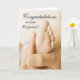 Uma mãe segurando um bebê com palavras dizendo Parabéns na sua gravidez faz um cartão de gravidez legal.