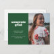 Anuncie a grande conquista do seu formando com este anúncio e convite de graduação simples, mas na moda. Ele apresenta as palavras "felicats formando" em uma fonte branca com estilo retrorreflector em um fundo verde, assim como espaço para uma foto na frente. Use o cartão postal para obter detalhes sobre a celebração do seu formando.