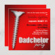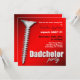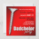 Legal quadrado vermelho #dadchelor convites com um parafuso grande de cinza. "Junte-se a nós para uma diversão maníaca como (pai a ser) espera Baby #1".