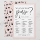 O chá de panela "o que há na sua bolsa" corresponde à nossa coleção de chás de panela do Romance em Paris e apresenta uma escrita negra e timítica e bordas cor-de-rosa suaves com uma pequena ilustração da silhueta da torre Eiffel. Personalize com o nome da noiva e a data do chá. Cartões de jogo revertem para nosso padrão românico em Paris.