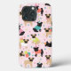Bela festa de aniversário Pug dog com casacos pretos e bronzeados vestidos de bonitinha de aniversário com balões, bolo e padrão de confete.