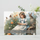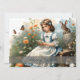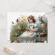 Uma jovem de vestido azul com tocas brancas senta-se num banco de madeira no meio de um jardim florescente. Ela está lendo uma pequena carta enquanto borboletas voam ao seu redor. Uma lebre e um coelho pequenos sentam ao lado dela, enquanto outras flores de primavera florescem em cores quentes no fundo. As palavras "Felz pascoa" dão à imagem um toque festivo.