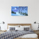 Um cheio de paisagem de fantasia 3D de neve brilhante e luzes de fada mágicas. Uma fileira de lâmpadas brilhantes ilumina o rastro através de uma passagem de montanha nevada encharcada por golpes rochosos. O brilhante caminho coberto de neve é mergulhado em árvores de abetos escuros. Do outro lado da fenda, um castelo de fada brilhante translúcido aguarda o viajante encantado em sua jornada para a feira.