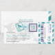 Um convite de bilhete inspirado em cartão de embarque com detalhes divertidos de carimbo de passaporte e listras de correio aéreo. Mostrado em tons de Aqua, Teal, Navy, Cinza Escuro e Cinza Claro. O verso inclui espaço extra para qualquer informação de hotel, viagem ou site.