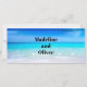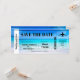 Uma imagem da praia tropical ao fundo é o cenário para este Salve a Data de casamento com tema de Passagem de Embarque para o Destino.