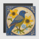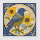 Ilustração colorida de uma ave empoleirada em um galho, cercada por flores amarelas e margaridas azuis. O trabalho de arte apresenta um padrão pontilhado e uma mistura harmoniosa de tons azuis, amarelos e sujos, criando uma composição animada e alegre.