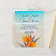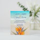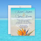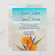 Convites de barato com tema de praia tropical. Pássaro laranja de flores do paraíso no fundo com água turquesa na imagem de fundo da praia. Modelos de texto são azuis no script de giro para nomes do casal e texto impresso para todas as informações do convite. Há espaço para listar o local de recepção conforme necessário. Os convites para baratos de tamanho menor, para um casamento orçamentário, são impressos em papel mais fino com envelopes opcionais ou escolhem o tamanho 5x8 (exigirá mais postagem).