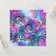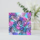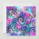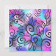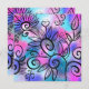 Um passarinho engraçado no canto superior esquerdo e elementos florais num fundo rosa, roxo e turquesa.