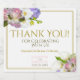 Essas lindas etiquetas de vinho espumante floral são uma forma excelente de obrigado para convidados especiais, família ou membros da sua festa noiva. Apresenta um design chic e elegante com texto dourado e cor-de-rosa sobre fundo branco com borda dourada. A fronteira é cortada com um belo aglomerado de flores de primavera em cores pastéis, incluindo rosas rosa, lírios e orquídeas brancos, e hidrônio roxo ou lavanda leve. O texto diz: Obrigado por Celebrar conosco, juntamente com o nome da data do casal e do casamento. Também há espaço para entrar no tipo de bebida ou outro conteúdo do frasco.