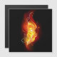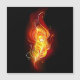 Pena de pavão brilhante feita de fogo e chamas sobre fundo negro.