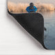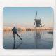 Mousepad com um patinagem no gelo do atleta em um rio congelado após juncos do hoar-fosco e um moinho de vento em uma manhã bonita do inverno nos Países Baixos.