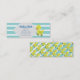 Estes cartões de visitas amarelos bonitos do pato caracterizam um ducky amarelo pequeno adorável sobre um fundo listrado azul do divertimento! Estes cartões de visitas bonitos do pato do bebê são certos deixar uma impressão durável e são perfeitos para qualquer um que ama patos e a arte bonito! As imagens criadas por Josy Carson, sucata de Zaza e tubos e Dana Conditt de digitalscrapdesigns.com e são usadas com permissão.