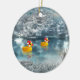 Os bonitos e bonitos patos de borracha de brinquedo vestem chapéus de Papai Noel num lago de Natal de inverno nevado ornamento de Natal