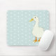 Um doce pato branco perguntando em pé, legal, contra um fundo azul com pontos brancos. Um presente maravilhoso para amantes de pato ou qualquer um que ama pássaros, animais ou natureza. Cartões, adesivos, ímã, caneca, avental, t-shirt, poster.