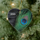 Enfeites de natal de penas de pavão único com um ano personalizável. O fundo de veludo negro da vida estática faz com que as cores brilhantes do verde e do azul da pena de pavão pareçam absolutamente vibrantes e atordoantes. Se você está decorando com um tema de Natal Pavão este ano isto é lindo.