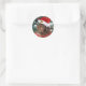 Este adesivo bonito mostra uma fotografia de um adorável cão labradroodle de chocolate vestindo o chapéu de Papai noel, sentado perto de uma árvore de Natal decorada, e as palavras "Feliz Natal".