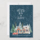 A cena tradicional da casa de neve com PEACE JOY & AMOR cartão de Natal. A saudação de Natal e a personalização estão atrás.