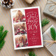 Belo cartão com fotos de Natal baseado em tipografia apresenta três das suas fotos favoritas em formato quadrado ao lado esquerdo. "Desejando-lhe paz, amor e alegria este Natal e sempre" aparece à direita com letras brancas tipográficas em um fundo vermelho de morango pontilhado com estrelas festivas. Personalize com sua saudação pessoal, nomes de família, nomes individuais e o ano. Cartões que se revertem a um padrão de neve branca e estrelas sobre fundo vermelho.