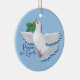 Este belo Enfeites de natal apresenta uma pomba branca de paz segurando um galho de oliveira na sua boca sobre um fundo azul claro com a legenda "Paz na Terra". Este ornamento pareceria um excelente pendurado na sua árvore de Natal, no seu espelho retrovisor, ou como uma ventoinha de teto. Adicione um cabo mais longo e vista-o como um pingente. Faz um presente de excelente ou um gafanhoto de estoque para o snowboarder na sua lista de presentes de Natal. Este ornamento tem impressão no lado do solteiro, mas também está disponível com impressão no lado duplo.