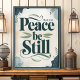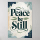 Uma peça de tipografia cristã vintage com as palavras "Peace Be still" num guião suave e fluente, emparelhado com uma letra serif calmante. O fundo é uma textura macia que se assemelha a pergaminho ou a linho envelhecidos. Há tons azuis calmantes, verdes macios e sotaques de ouro mudados. Bordas deliciosas inspiradas na natureza, como folhas ou ondas, são incorporadas em torno do texto.