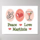 Símbolo de paz, coração e martini cor-de-rosa com uma azeitona que diz Peace Love Martinis sobre camisetas bonitinhas, roupa, artigos de papelaria e mais presentes que celebram esta bebida de festa e bebida alcoólica. Isso faz uma bela noite de meninas com um presente de amizade, um presente de anfitriã ou um presente para um barman.