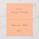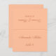 Um simples cartão de casamento de pêssego, com o nome do convidado e o número da mesa impresso na frente, o nome da noiva e do noivo e a data do casamento impressa no outro lado (ou seja, a outra metade, antes de dobrá-lo). Todo o texto é um roteiro caligráfico marrom aterrorizado. Tamanho: 4,5" x 5,6" antes da dobragem, ou seja, 4,5" x 2,8" após a dobragem.
