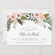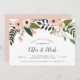 Celebre o feliz casal com estes convites de festa de noivado floral. O design apresenta uma borda superior de flores cor-de-rosa-pincel e cor-de-pêssego em cascata com botânicos verdes e peludos. Personalize com seus detalhes de festa de noivado em serifa escura e letras de caligrafia.