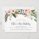Os convites de aniversário florais chicos para o primeiro aniversário, aniversários de criança ou qualquer idade, apresentam uma borda superior em cascata de flores cor-de-rosa-pincel e cor-de-pêssego com um verde botânico exuberante. Personalize com seus detalhes de festa de aniversário em serifa escura e letras de caligrafia.