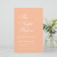 Um convite simples e minimalista para o ensaio de pêssego jantar. Tem apenas um texto branco sobre fundo de pêssego. O título "O Antes da Noite" é escrito em caligrafia elegante, a ocasião "Janto de ensaio" e o nome são escritos em bonés maiores, o restante em bonés pequenos. O texto fica alinhado.
