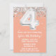 Pêssego e convite de festas de prata 4 anos de idade 4 convites de aniversário com brilho e moderno escrevendo de roteiro e balões de folha divertida.
