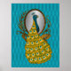 Um pavão, com a sua colorido plumagem atrás dele, admira-se num espelho ornamentado de cor dourada contra um fundo azul teal piscado neste impressão poster. Da minha imagem original criada digitalmente.