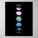 Uma lua apresenta um gráfico de fases em cores opalinas bonito, cor-de-rosa, lavanda, turquesa e azul contra um fundo preto estrelado.