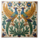 Dois pavões se encarando com cabeças azuis, asas amarelas e caudas verdes, cercados por ornamentos florais em um azulejo quadrado.