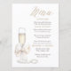 This adorable vintage chic menu design reflects modern elegance and timeless charm, featuring a romantic off-white cream bow and a prosecco glass with white pearls nearby.