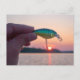 Um pescador masculino segurando uma pequena isca que prendia um sol em um lago no cartão postal da Finlândia Ocidental.